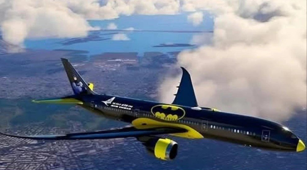 El diseño exterior del avión presenta una combinación de colores negro y dorado, evocando la estética del Batimóvil.