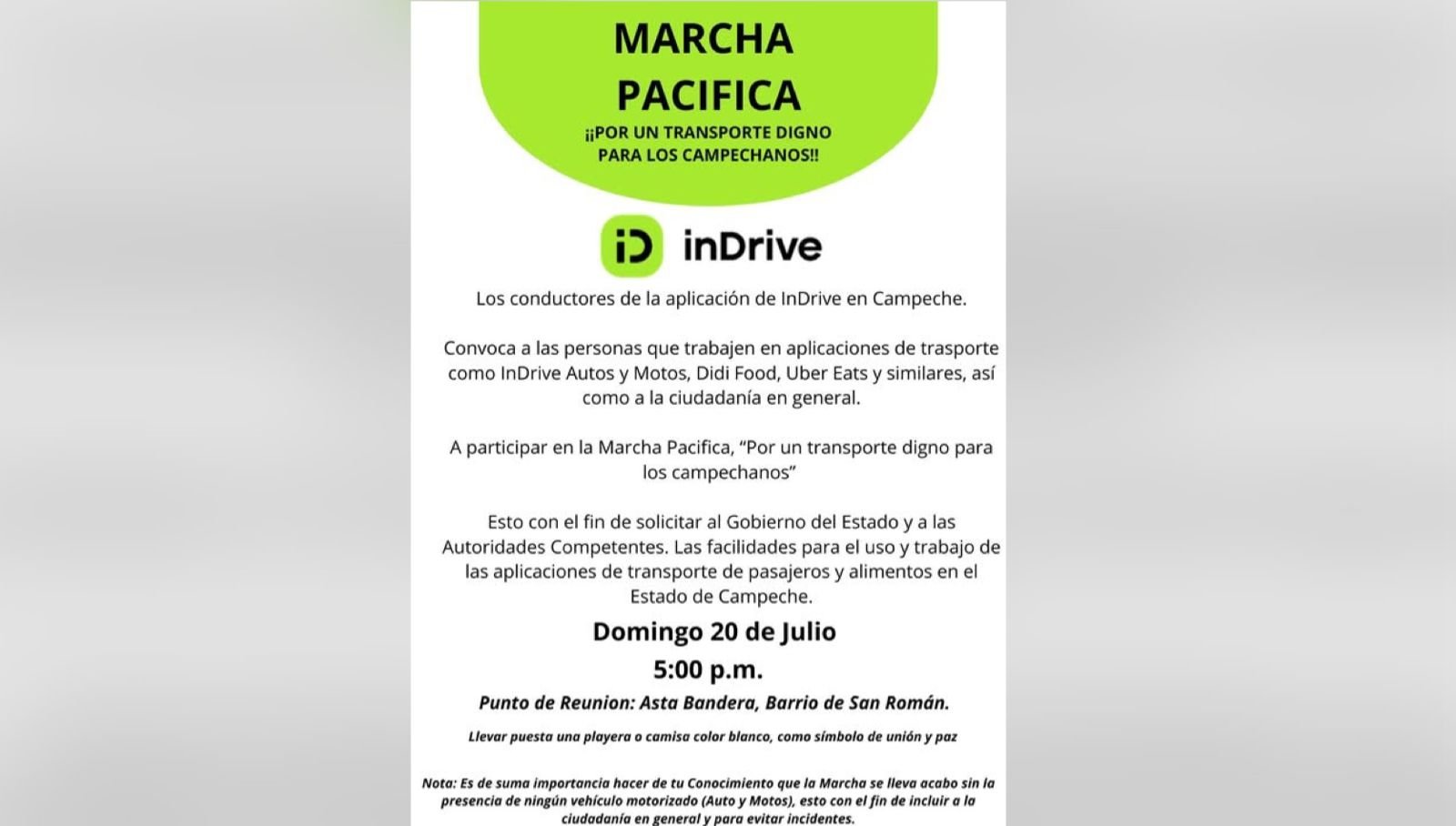 En medio de agresiones y trabas para legalizar su servicio, conductores de motocicleta que operan mediante la plataforma InDrive convocaron a una marcha pacífica el próximo domingo 20 de julio a las 5 de la tarde, en el asta bandera del barrio de San Román, para exigir respeto a su trabajo y un trato justo por parte de las autoridades.