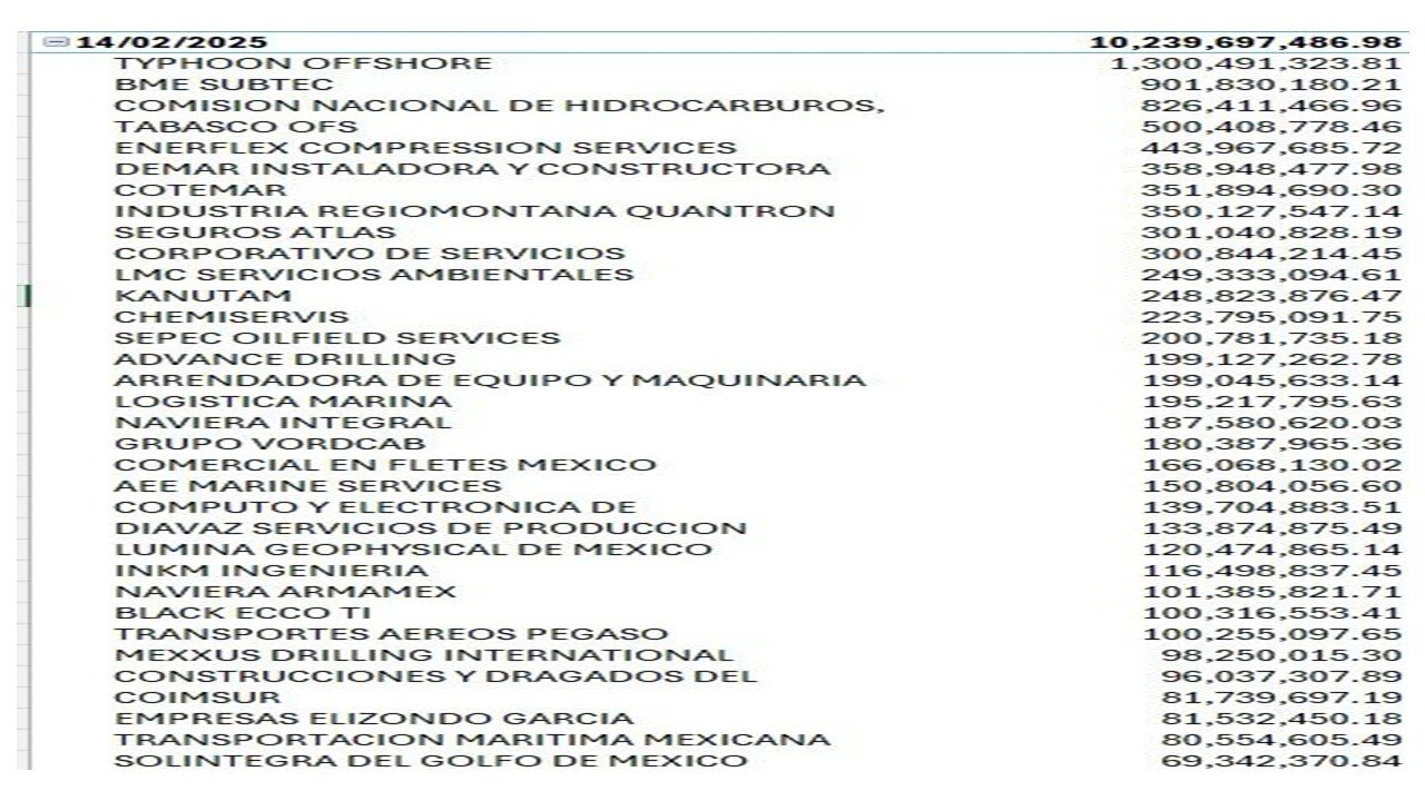 Petróleos Mexicanos (PEMEX) realizó un abono por un total de 10 mil 239 millones 697 mil 486.98 pesos a más de 30 empresas, lo cual fue dado a conocer a través de una lista filtrada a medios de comunicación. Sin embargo, esto no se ha reflejado a las empresas subcontratadas, a las que las grandes compañías no están cumpliendo con los pagos, lo que afecta la liquidez de las firmas locales.